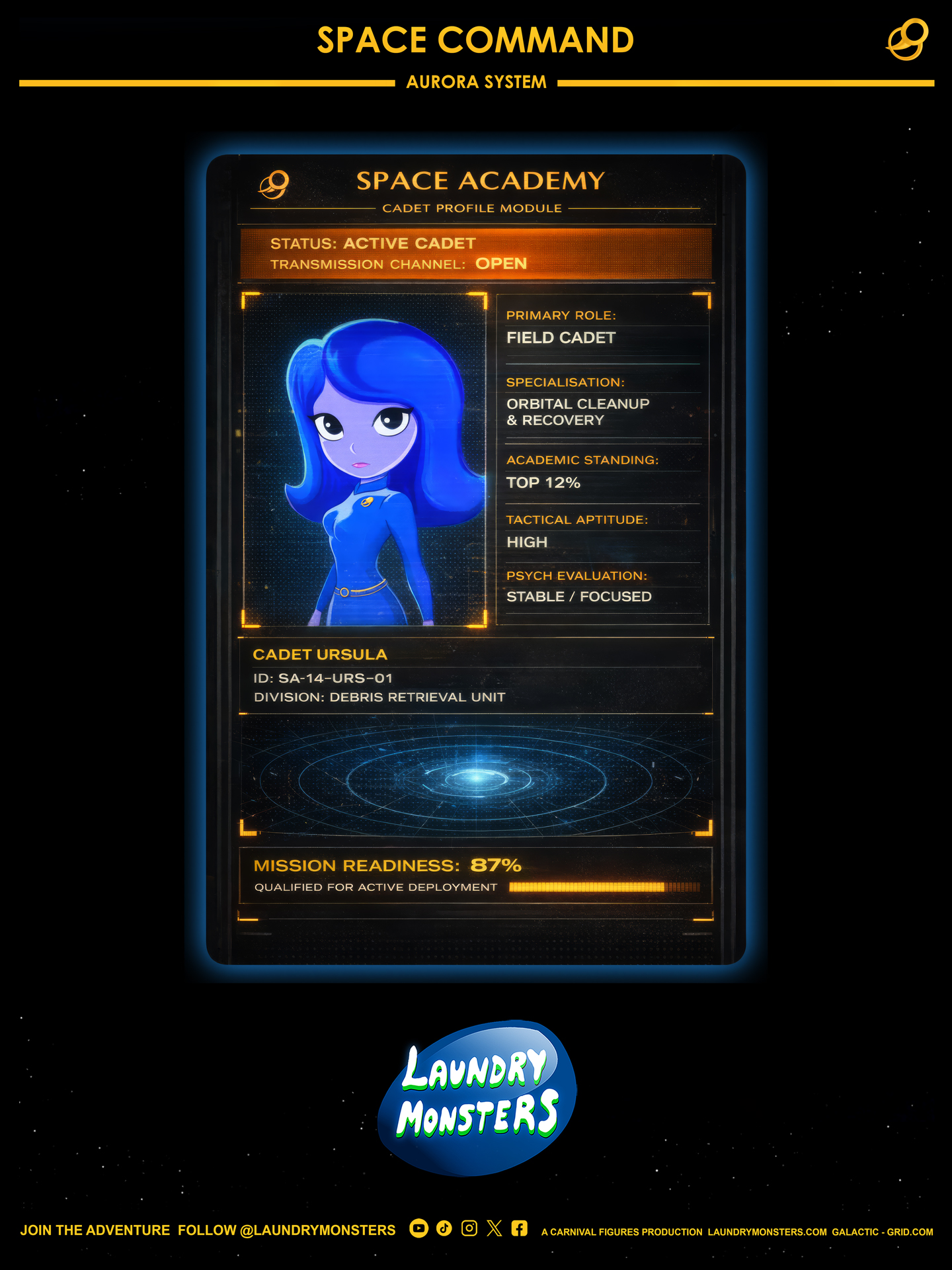 Backstory: Ursula grew up chasing comets, dreaming of exploring galaxies. Ursula’s tactical prowess and empathy unite the Super Squad. Questioning the Zorgons’ evil, she leads with honour, forging a heroic legacy against galactic threats.